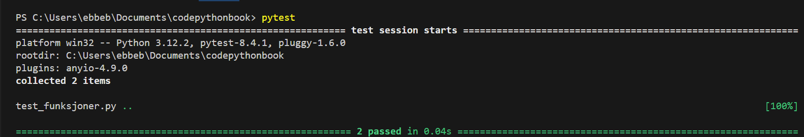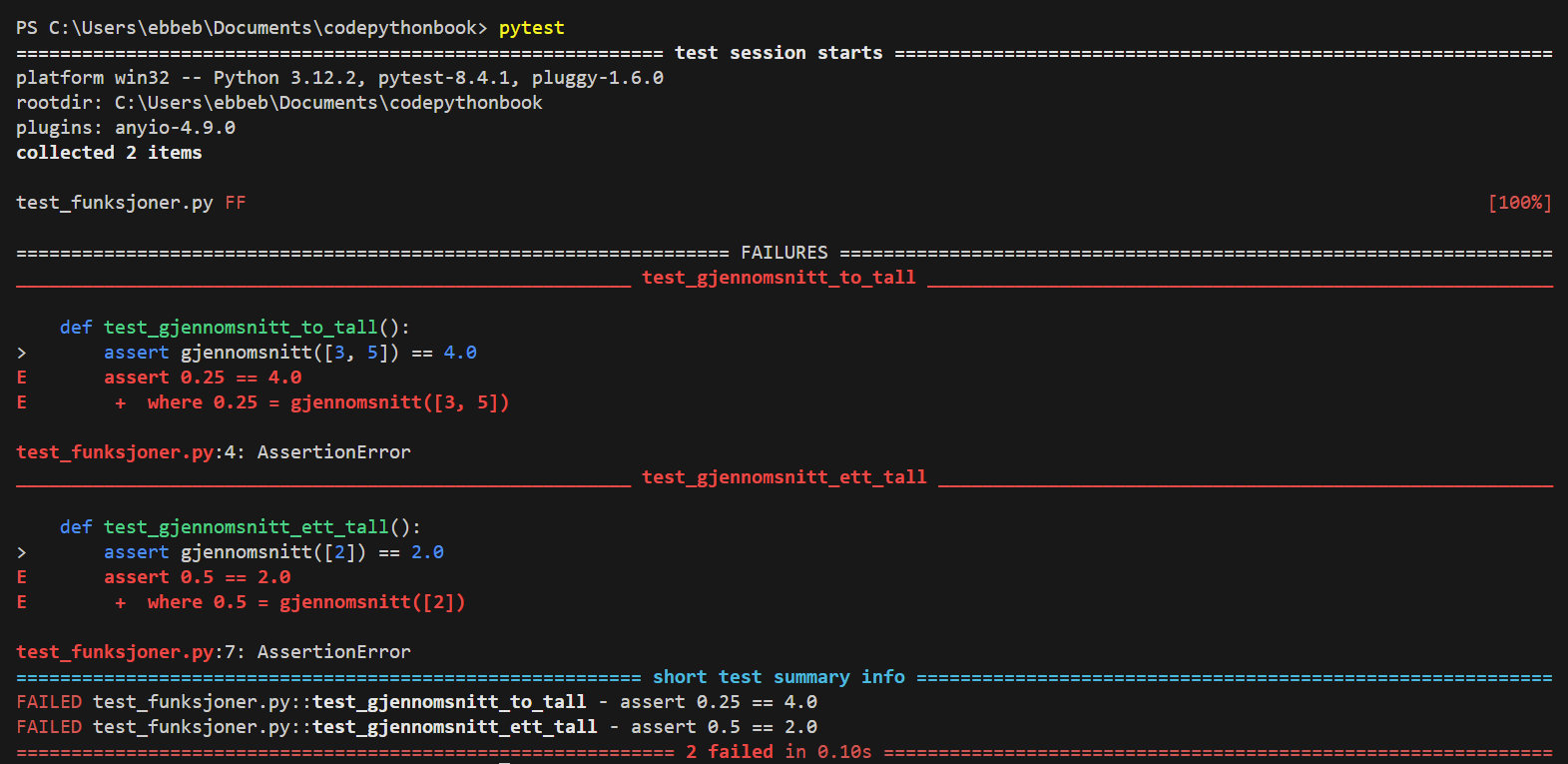 I seksjon 12.6 skrev vi tester for funksjonen gjennomsnitt() ved å bruke den eksterne pakken pytest. Nå skal du skrive de samme testene, men denne gangen ved å bruke pakken unittest i standardbiblioteket. Her må du greie deg selv uten noen håndholding fra min side. Start med å se på dokumentasjonen for unittest her: